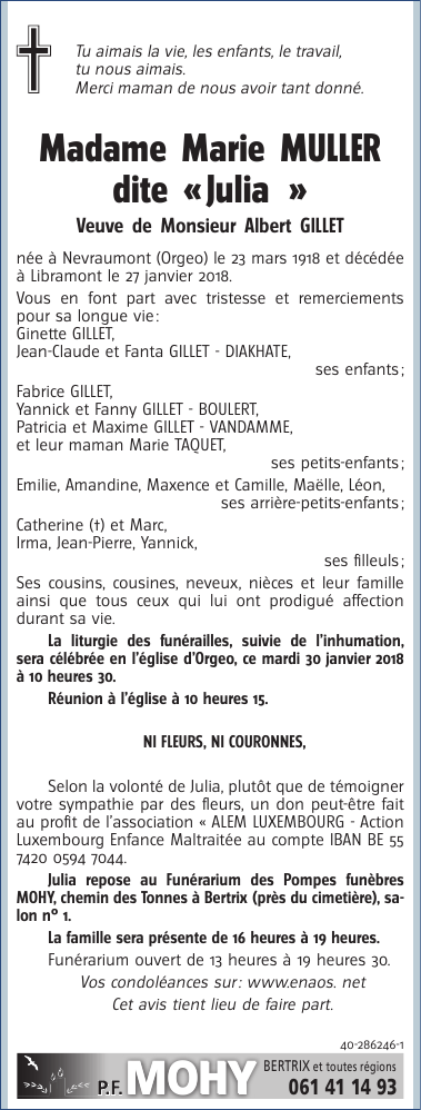 Décédée à Libramont (6800) le samedi 27 janvier 2018 à l'âge de 99 ans