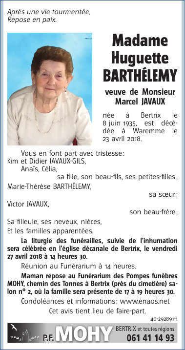 Veuve de Monsieur Marcel JAVAUX