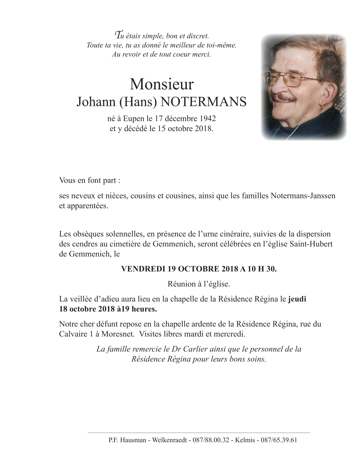 Décédé à Eupen (4700) le lundi 15 octobre 2018 à l'âge de 75 ans