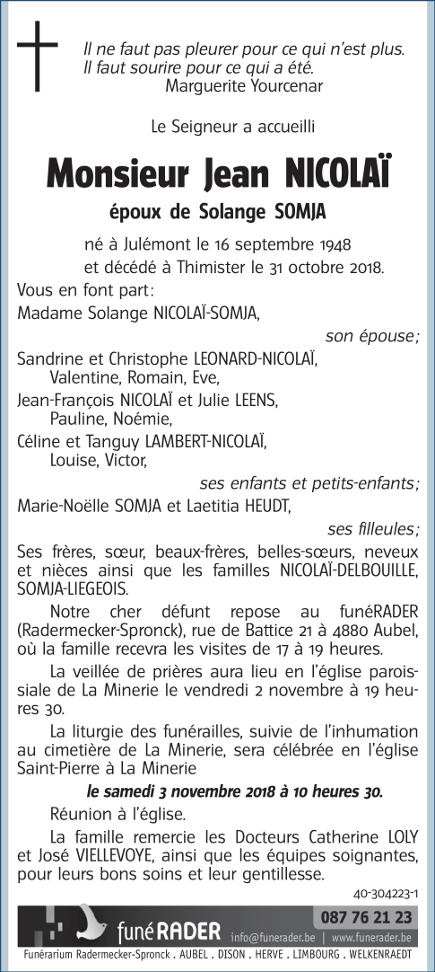 Décédé à Thimister (4890) le mercredi 31 octobre 2018 à l'âge de 70 ans