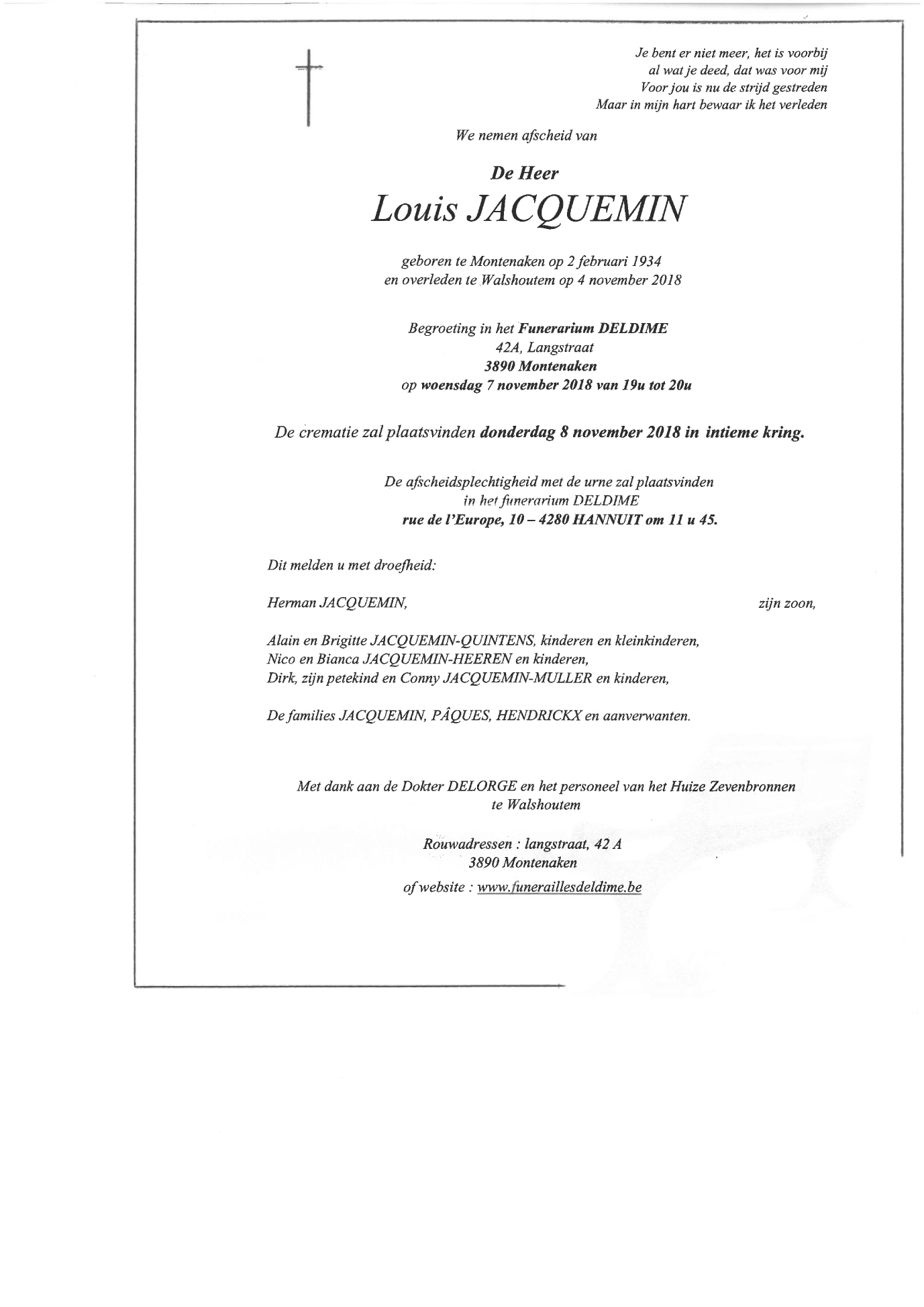 Décédé à Walshoutem (3401) le dimanche 4 novembre 2018 à l'âge de 84 ans
