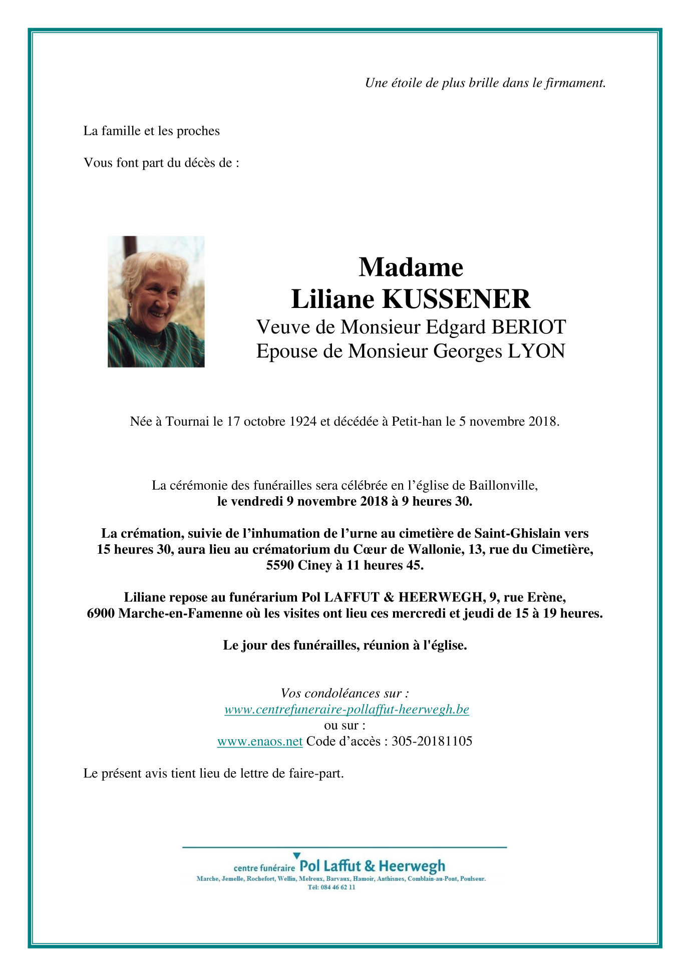 Overleden te Petit-Han (6940) op maandag 5 november 2018 op 94-jarige leeftijd