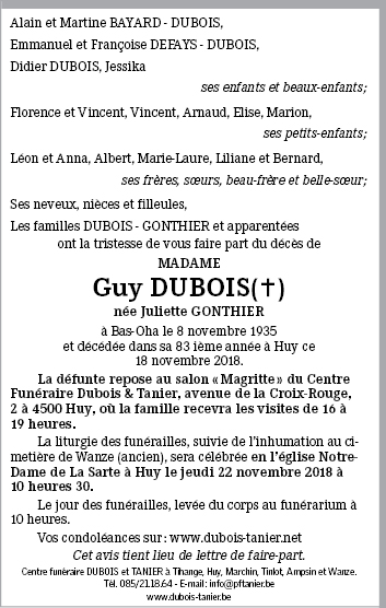 Décédée à Huy (4500) le dimanche 18 novembre 2018 à l'âge de 83 ans