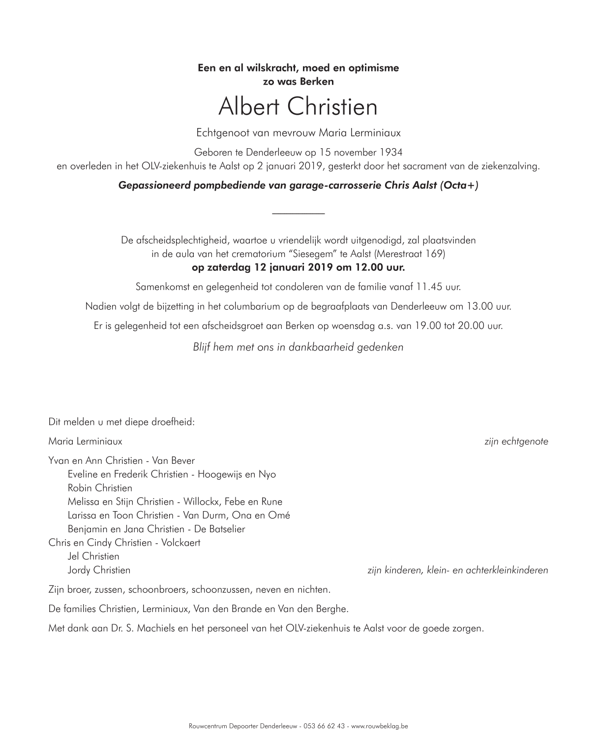 Décédé à Aalst (9300) le mercredi 2 janvier 2019 à l'âge de 84 ans