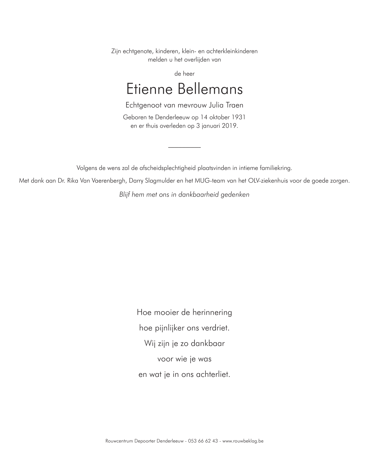 Décédé à Denderleeuw (9470) le jeudi 3 janvier 2019 à l'âge de 87 ans