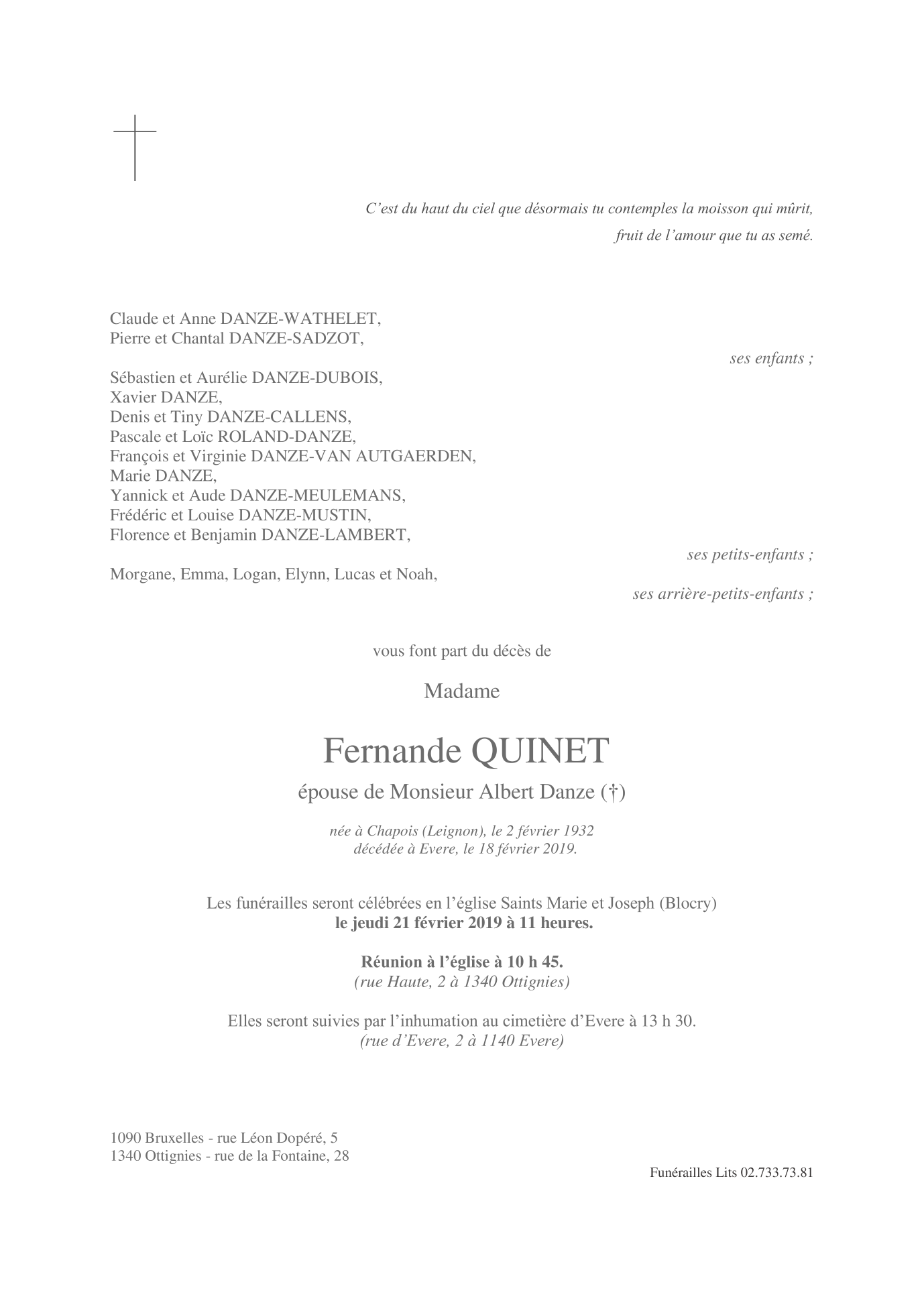 Décédée à Evere (1140) le lundi 18 février 2019 à l'âge de 87 ans