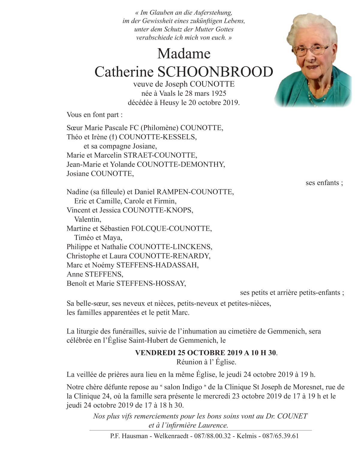 Décédée à Heusy (4802) le dimanche 20 octobre 2019 à l'âge de 94 ans