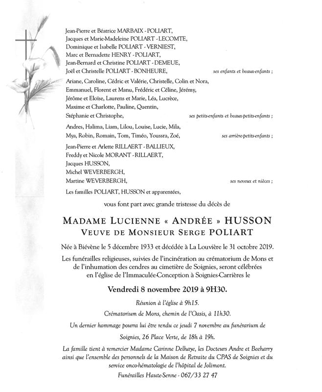 Décédée à La Louvière (7100) le jeudi 31 octobre 2019 à l'âge de 85 ans