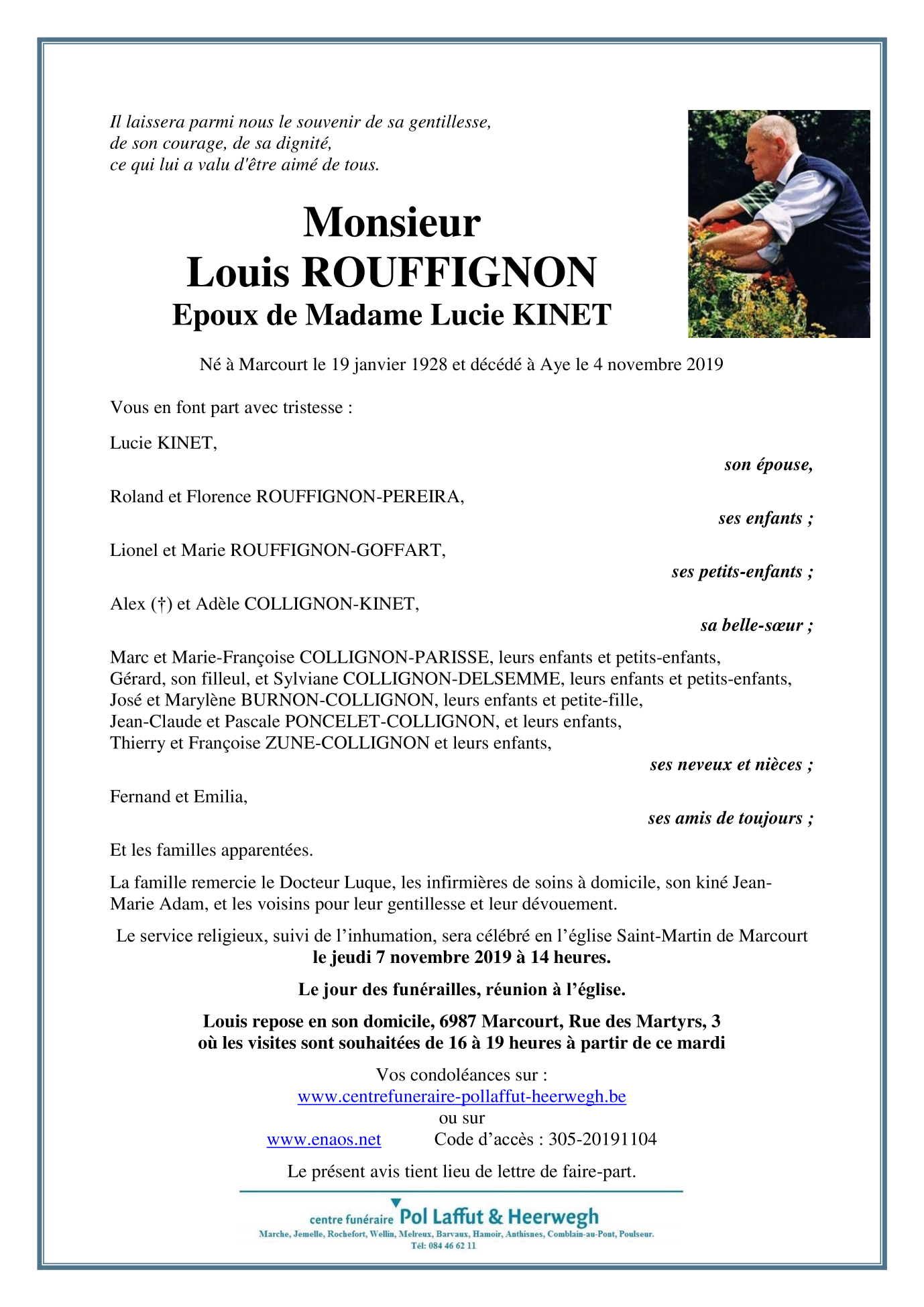 Fallecido en Aye (6900) el lunes, 4 de noviembre de 2019 a la edad de 91 años