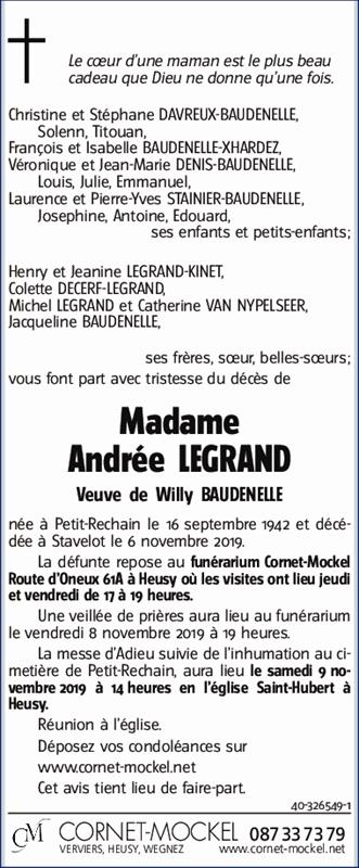Fallecida en Stavelot (4970) el miércoles, 6 de noviembre de 2019 a la edad de 77 años