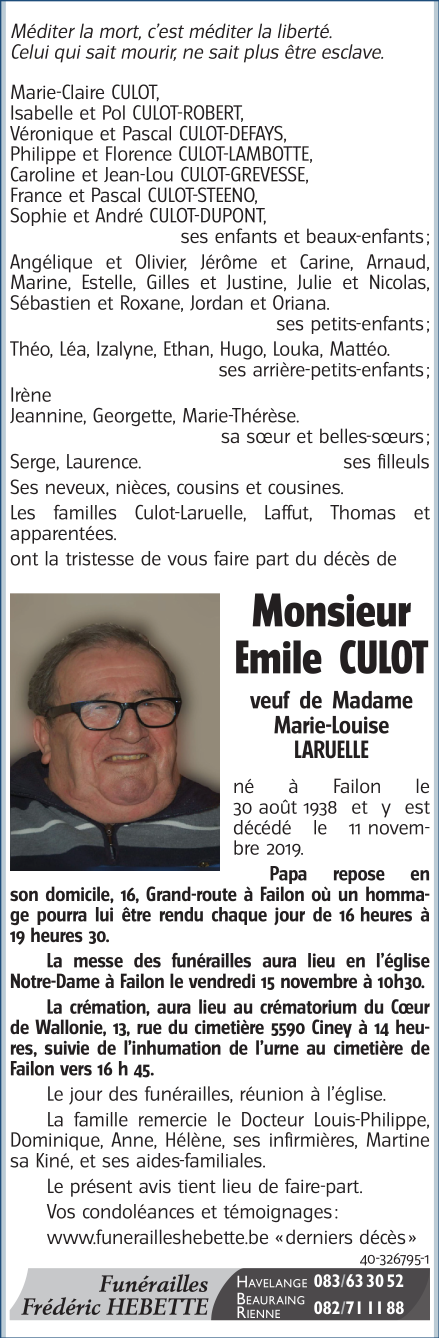 Décédé à Failon (5370) le lundi 11 novembre 2019 à l'âge de 81 ans