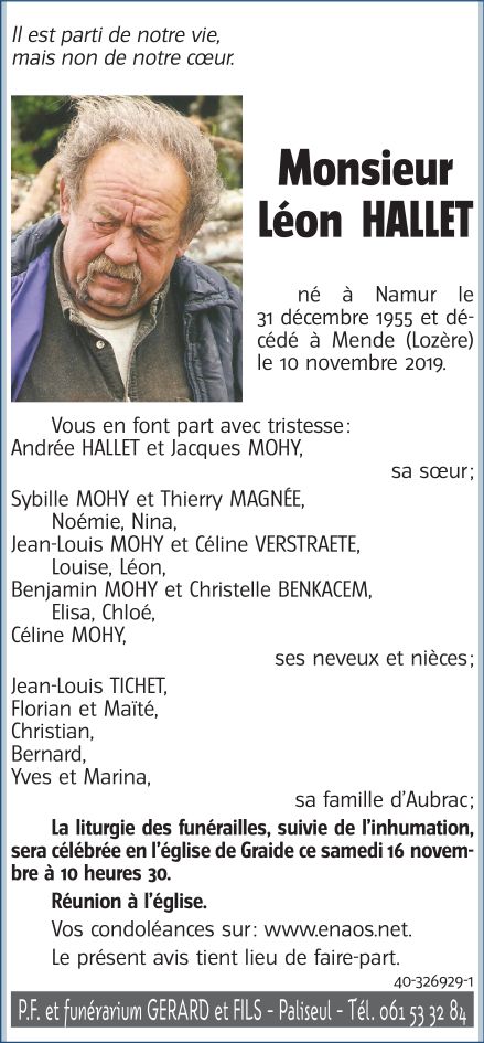 Décédé à Mende (48000, France) le mercredi 13 novembre 2019 à l'âge de 63 ans