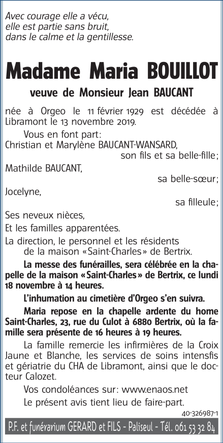 Décédée à Libramont (6800) le mercredi 13 novembre 2019 à l'âge de 90 ans
