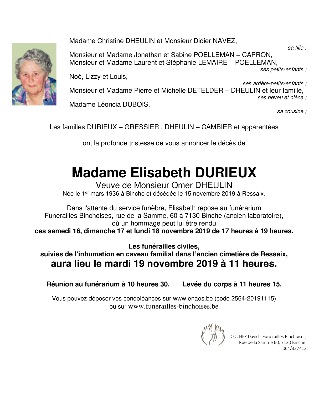 Fallecida en Ressaix (7134) el viernes, 15 de noviembre de 2019 a la edad de 83 años