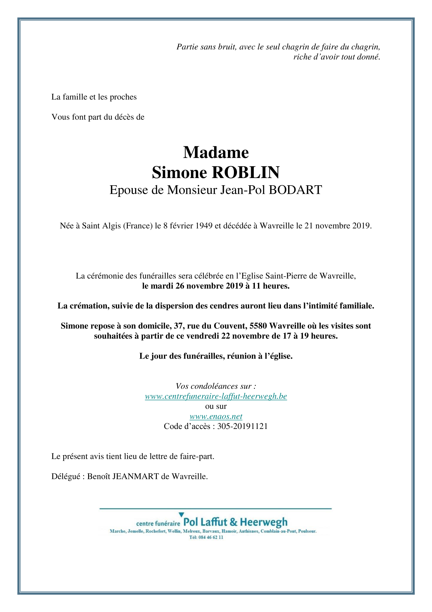 Décédée à Wavreille (5580) le jeudi 21 novembre 2019 à l'âge de 70 ans