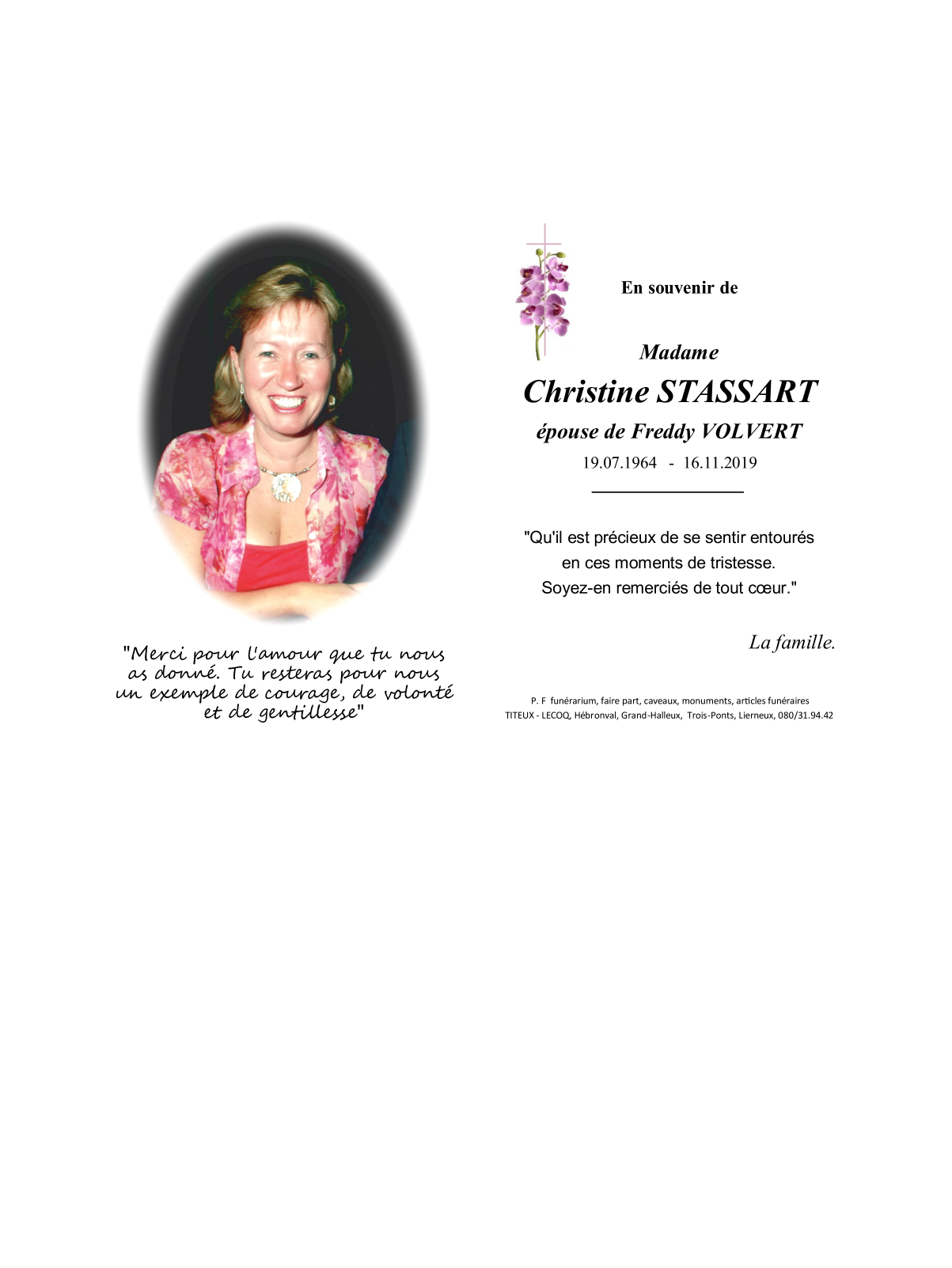Décédée à Chêne-al-Pierre (6960) le samedi 16 novembre 2019 à l'âge de 55 ans
