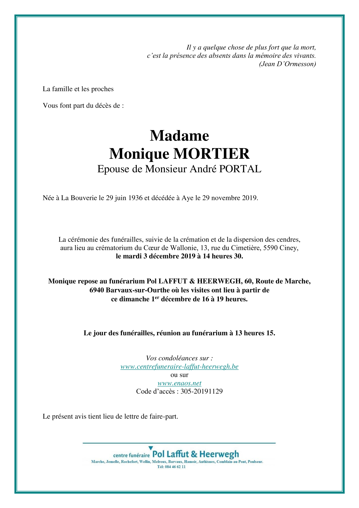 Décédée à Marche-en-Famenne (6900) le vendredi 29 novembre 2019 à l'âge de 83 ans