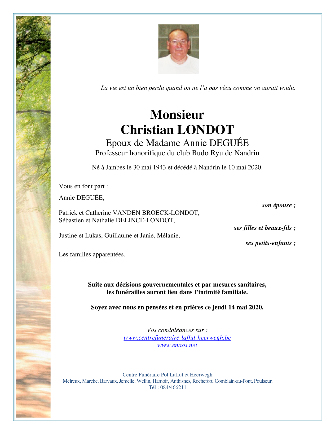 Décédé à Yernée-Fraineux (4550) le dimanche 10 mai 2020 à l'âge de 76 ans