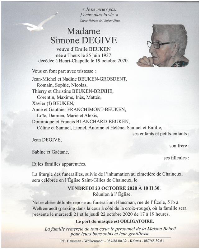 Décédée à Henri-Chapelle (4841) le lundi 19 octobre 2020 à l'âge de 83 ans