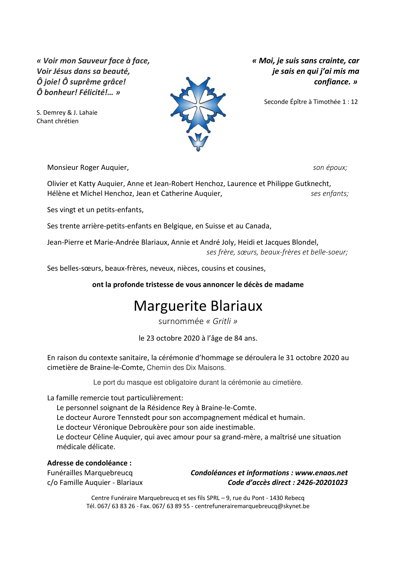 Décédée à Braine-le-Comte (7090) le vendredi 23 octobre 2020 à l'âge de 84 ans