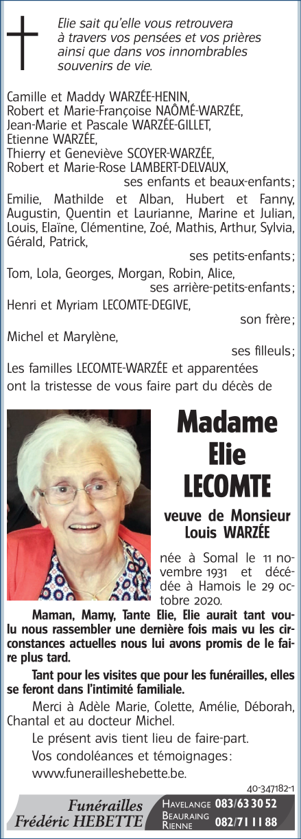 Décédée à Hamois (5360) le jeudi 29 octobre 2020 à l'âge de 88 ans