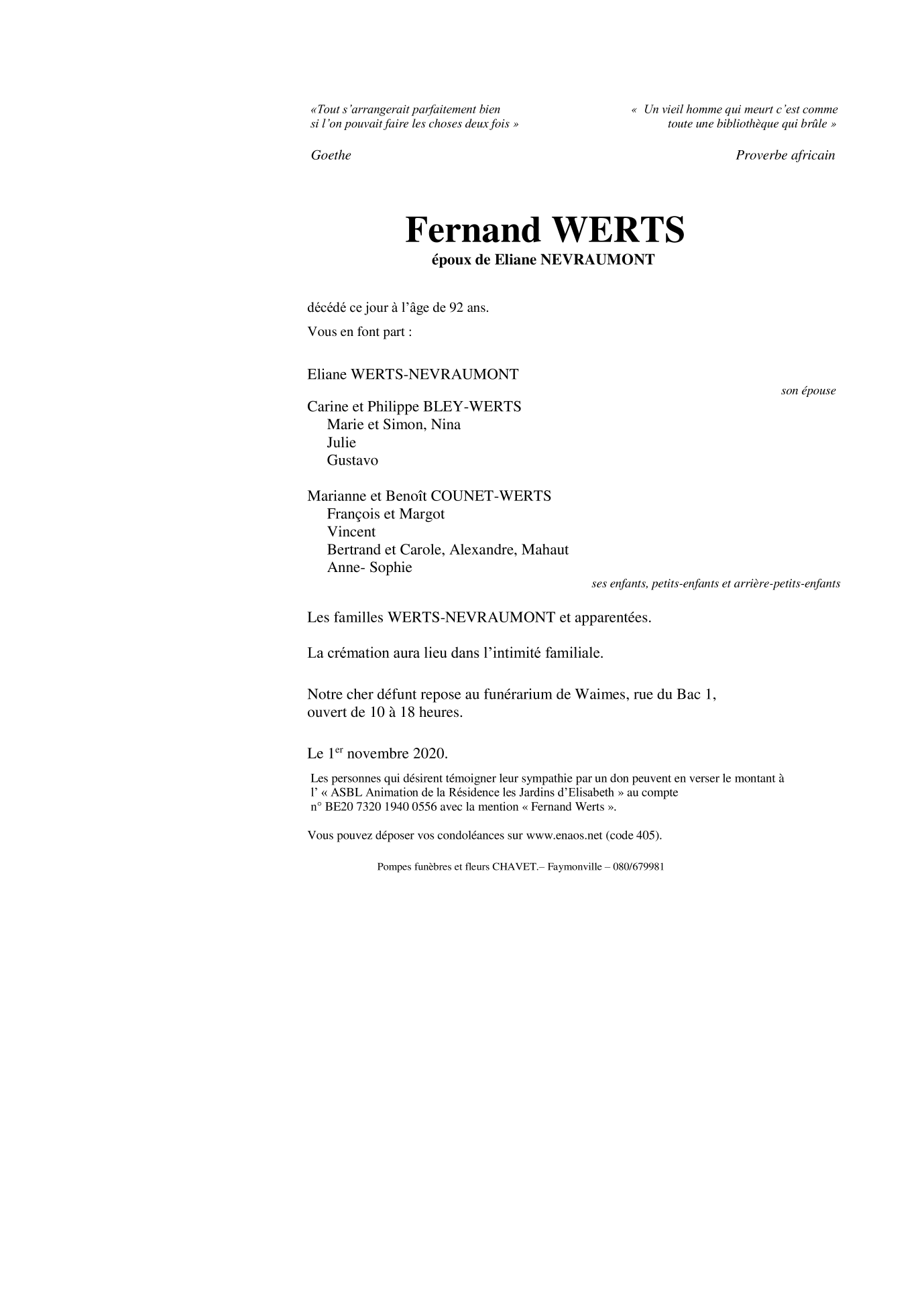 Décédé à Waimes (4950) le dimanche 1 novembre 2020 à l'âge de 92 ans