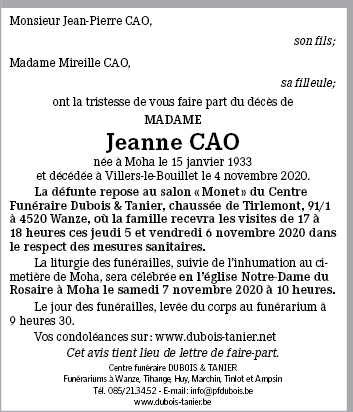 Décédée à Villers-le-Bouillet (4530) le mercredi 4 novembre 2020 à l'âge de 87 ans