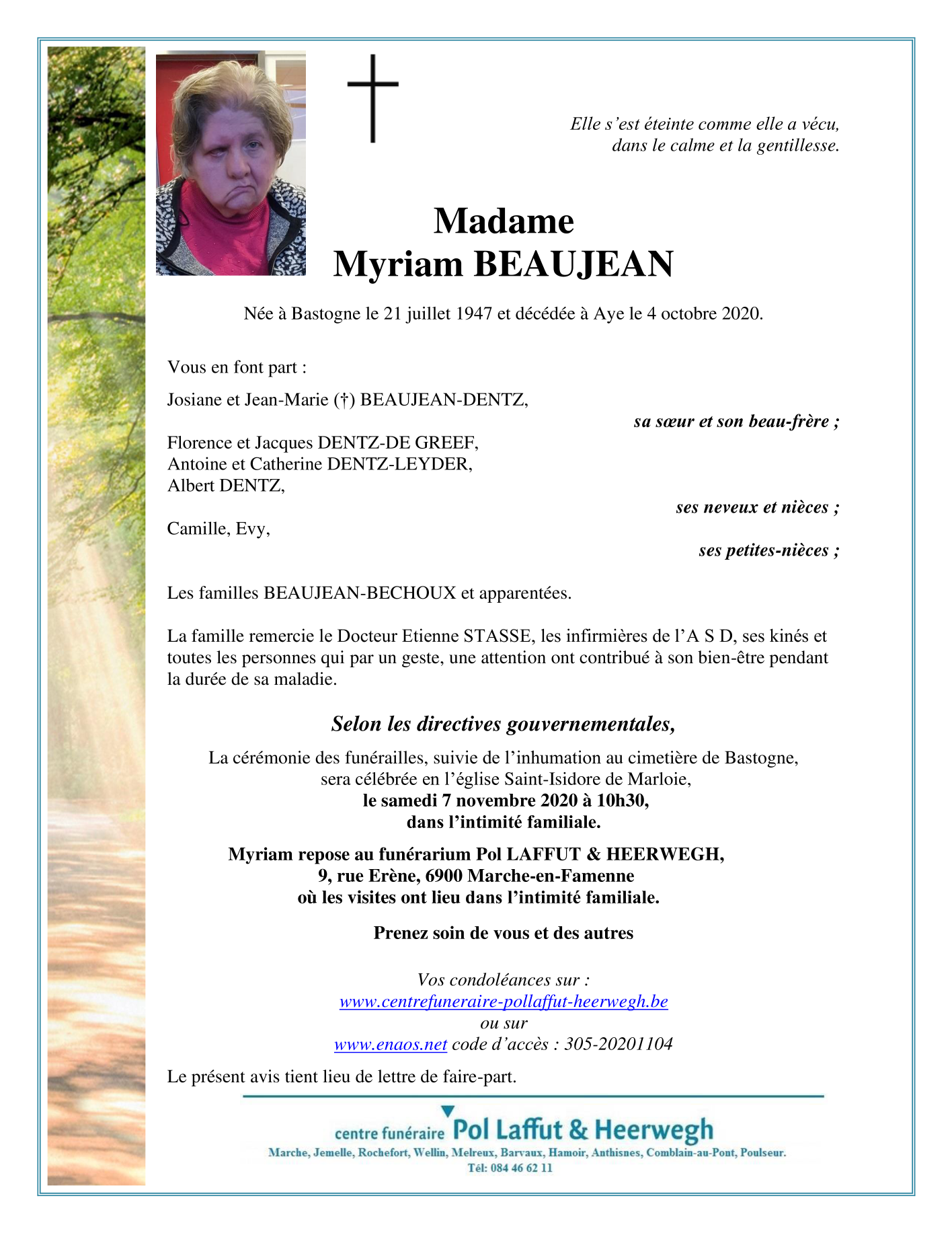 Fallecida en Aye (6900) el miércoles, 4 de noviembre de 2020 a la edad de 73 años