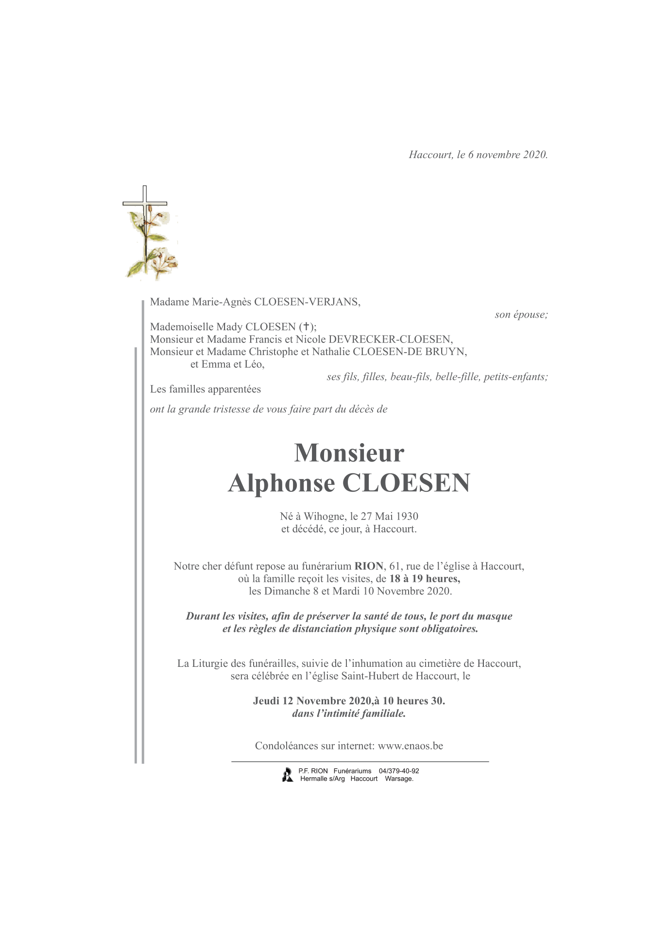 Décédé à Haccourt (4684) le vendredi 6 novembre 2020 à l'âge de 90 ans