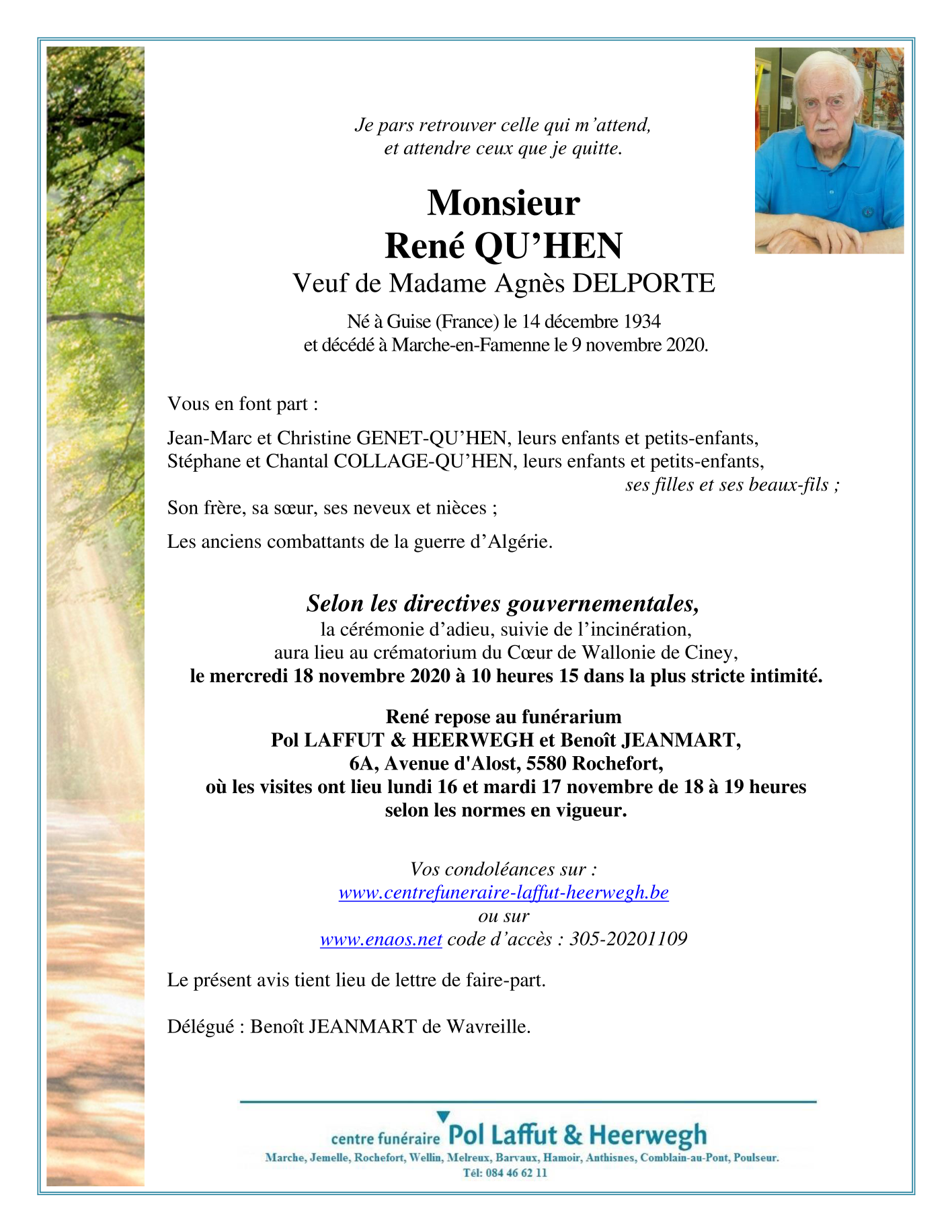 Décédé à Marche-en-Famenne (6900) le lundi 9 novembre 2020 à l'âge de 85 ans