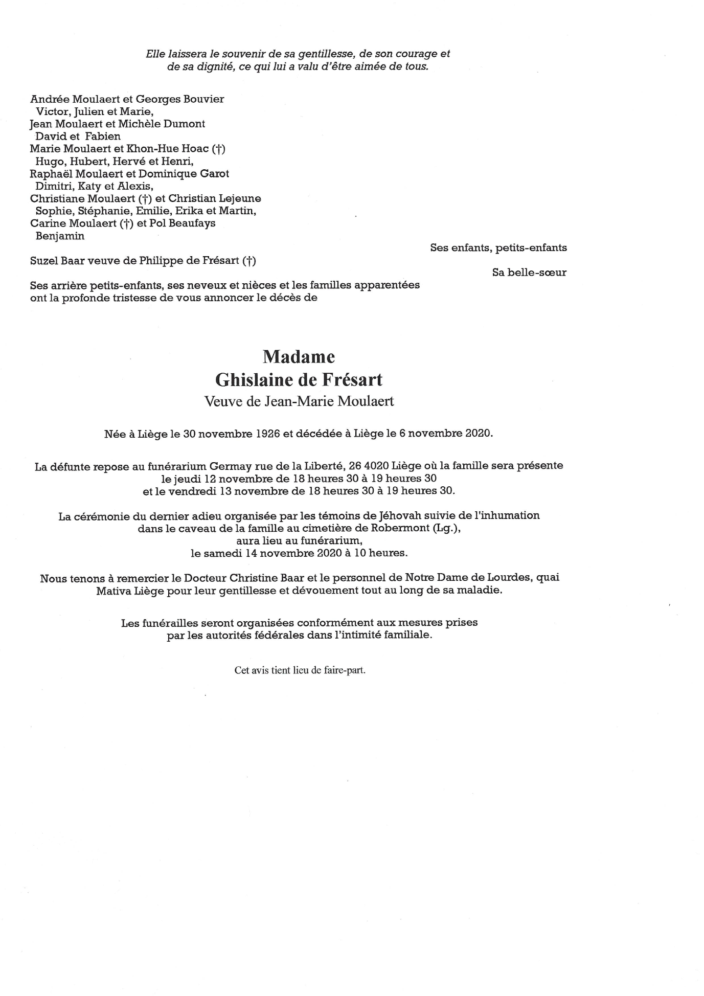 Décédée à Liège (4020) le vendredi 6 novembre 2020 à l'âge de 93 ans