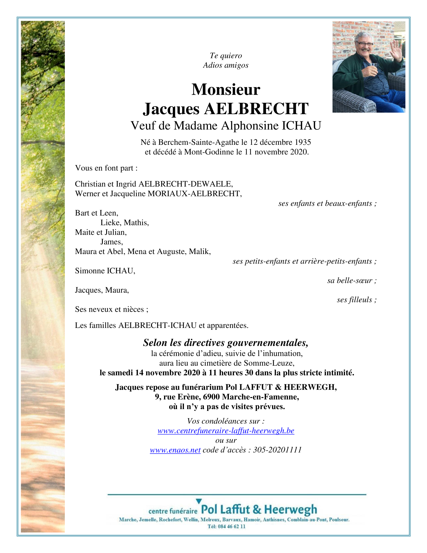 Décédé à Mont-Godinne (5530) le mercredi 11 novembre 2020 à l'âge de 84 ans