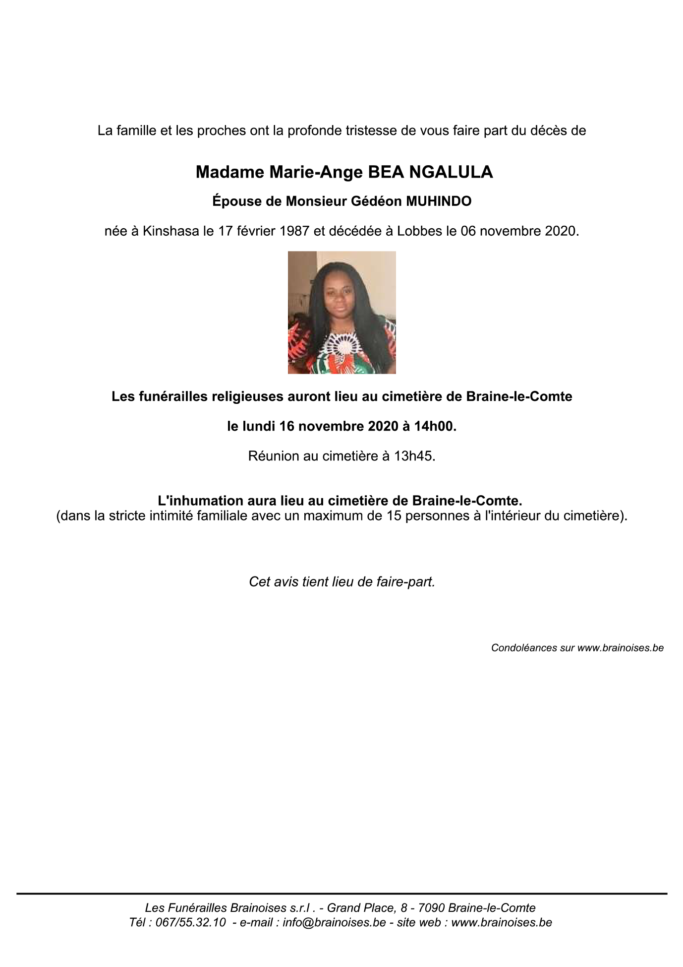 Décédée à Lobbes (6540) le vendredi 6 novembre 2020 à l'âge de 33 ans