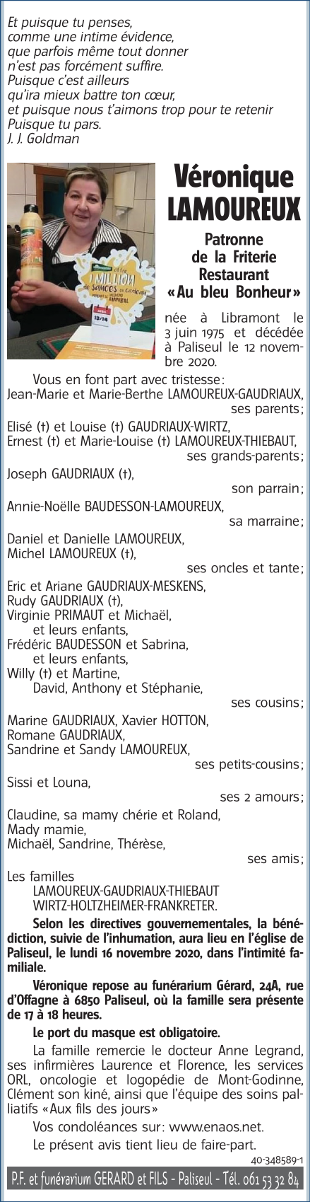 Fallecida en Paliseul (6850) el jueves, 12 de noviembre de 2020 a la edad de 45 años