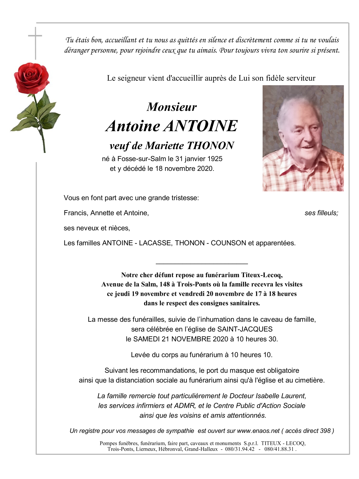 Décédé à Fosse sur Salm (4980) le mercredi 18 novembre 2020 à l'âge de 95 ans