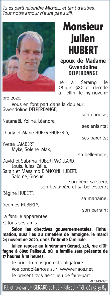 Décédé à Tellin (6927) le jeudi 19 novembre 2020 à l'âge de 38 ans