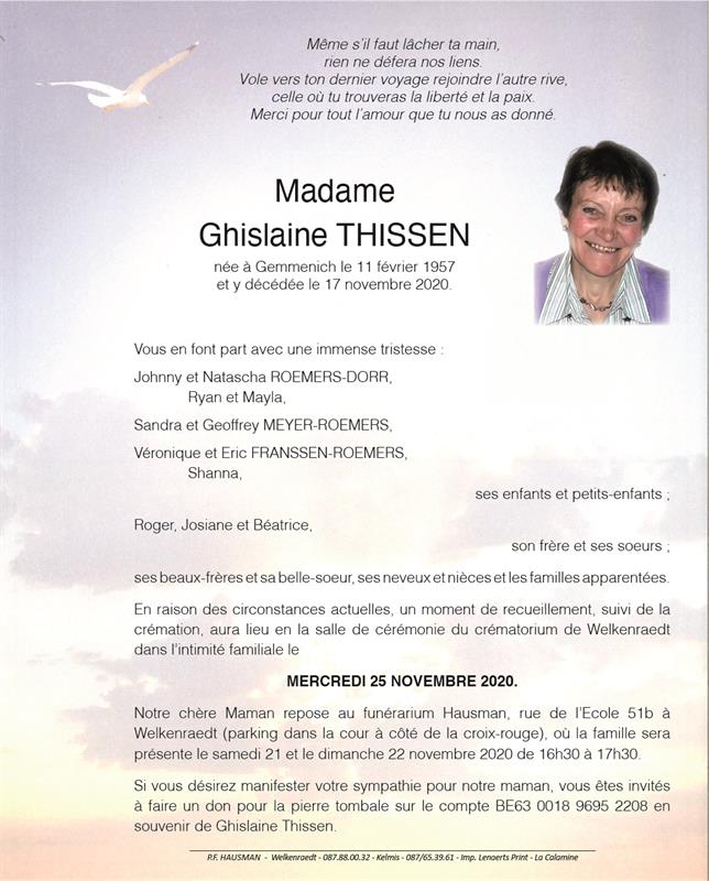 Décédée à Gemmenich (4851) le mardi 17 novembre 2020 à l'âge de 63 ans