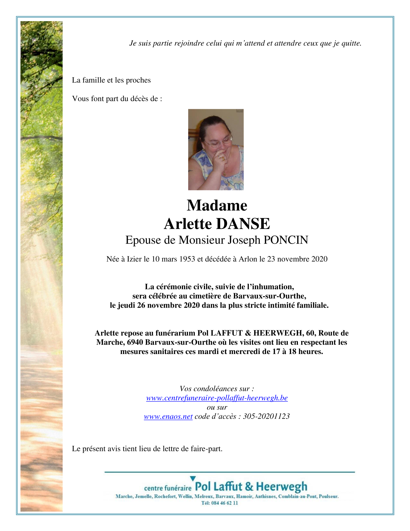 Décédée à Arlon (6700) le lundi 23 novembre 2020 à l'âge de 67 ans