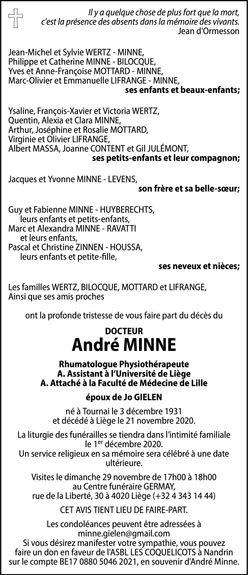 Décédé à Liège (4000) le samedi 21 novembre 2020 à l'âge de 88 ans