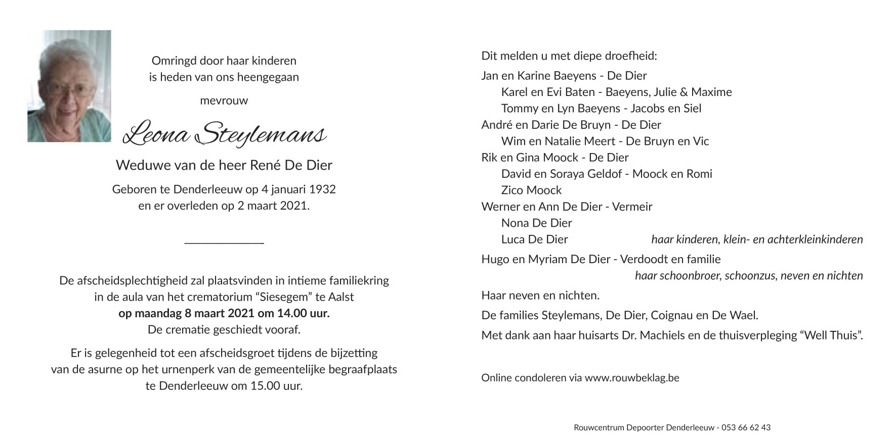 Décédée à Denderleeuw (9470) le mardi 2 mars 2021 à l'âge de 89 ans