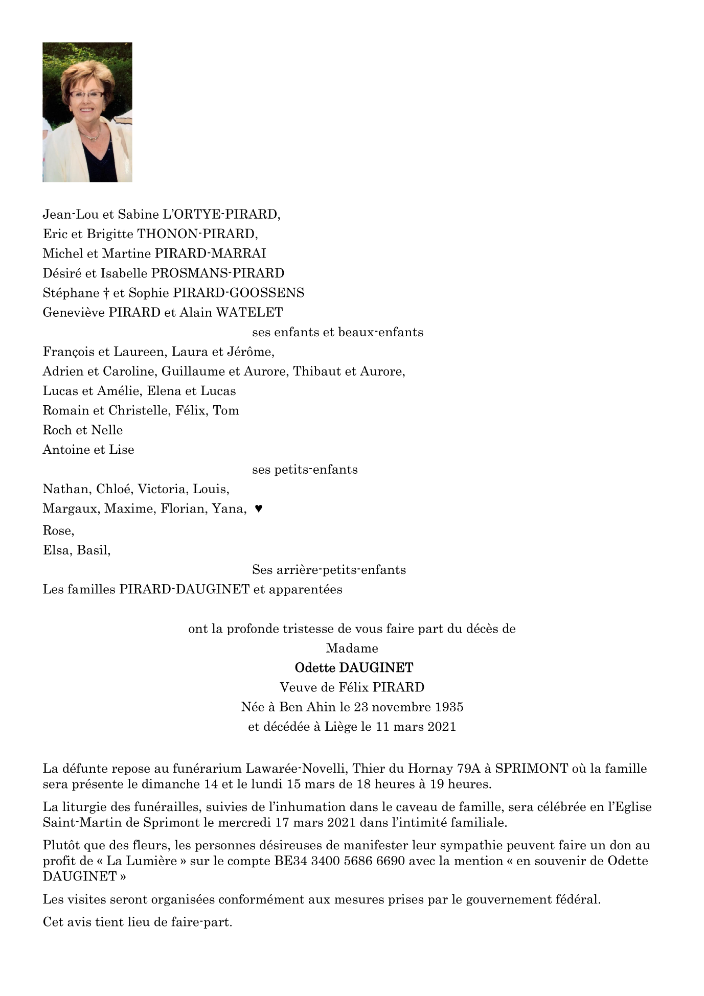 Décédée à Liège (4000) le jeudi 11 mars 2021 à l'âge de 85 ans