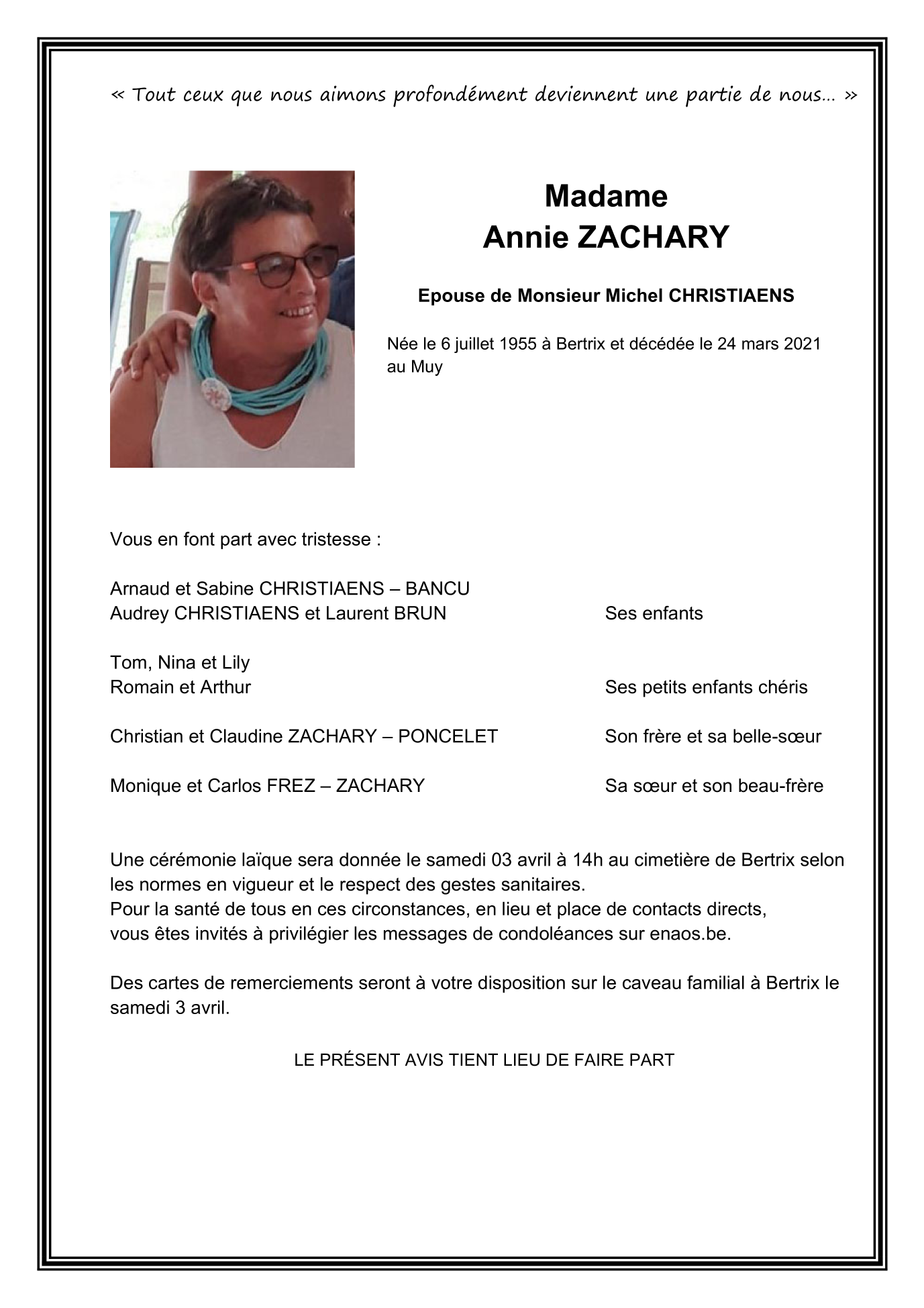 Décédée à Le Muy (83490, France) le mercredi 24 mars 2021 à l'âge de 65 ans