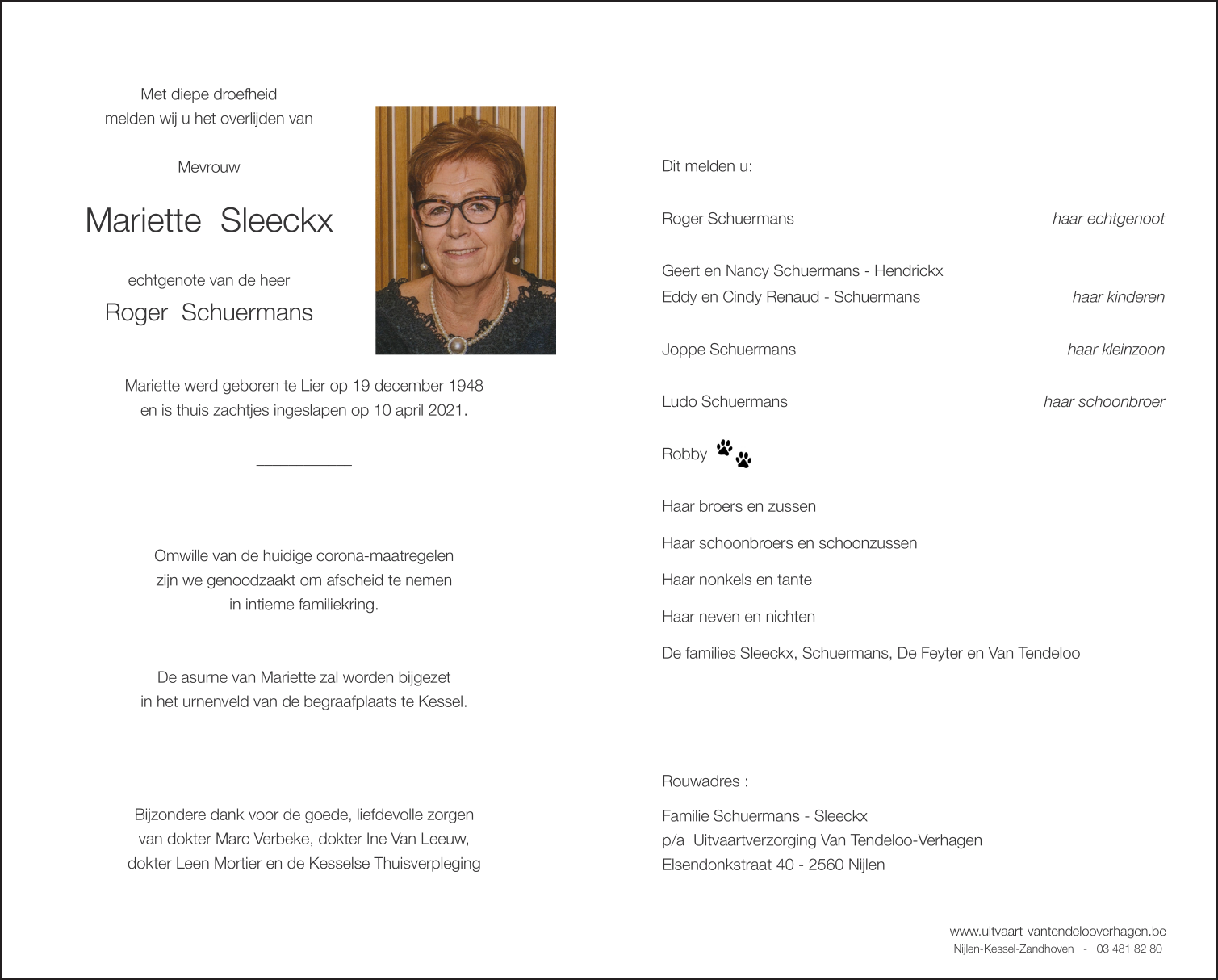 Décédée à Kessel (2560) le samedi 10 avril 2021 à l'âge de 72 ans