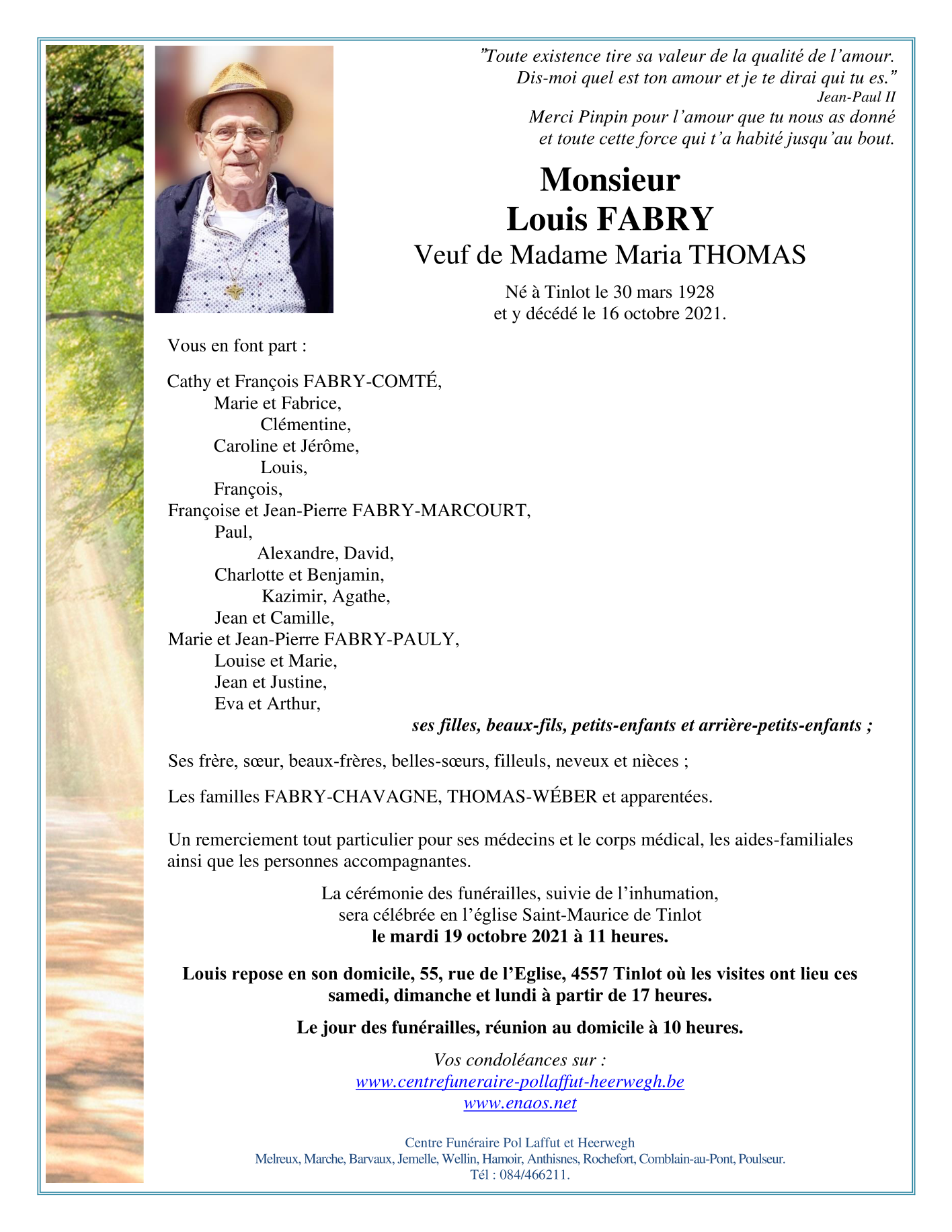 Décédé à Tinlot (4557) le samedi 16 octobre 2021 à l'âge de 93 ans