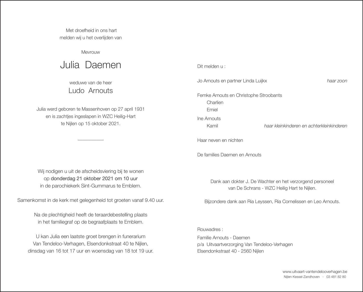Décédée à Nijlen (2560) le vendredi 15 octobre 2021 à l'âge de 90 ans