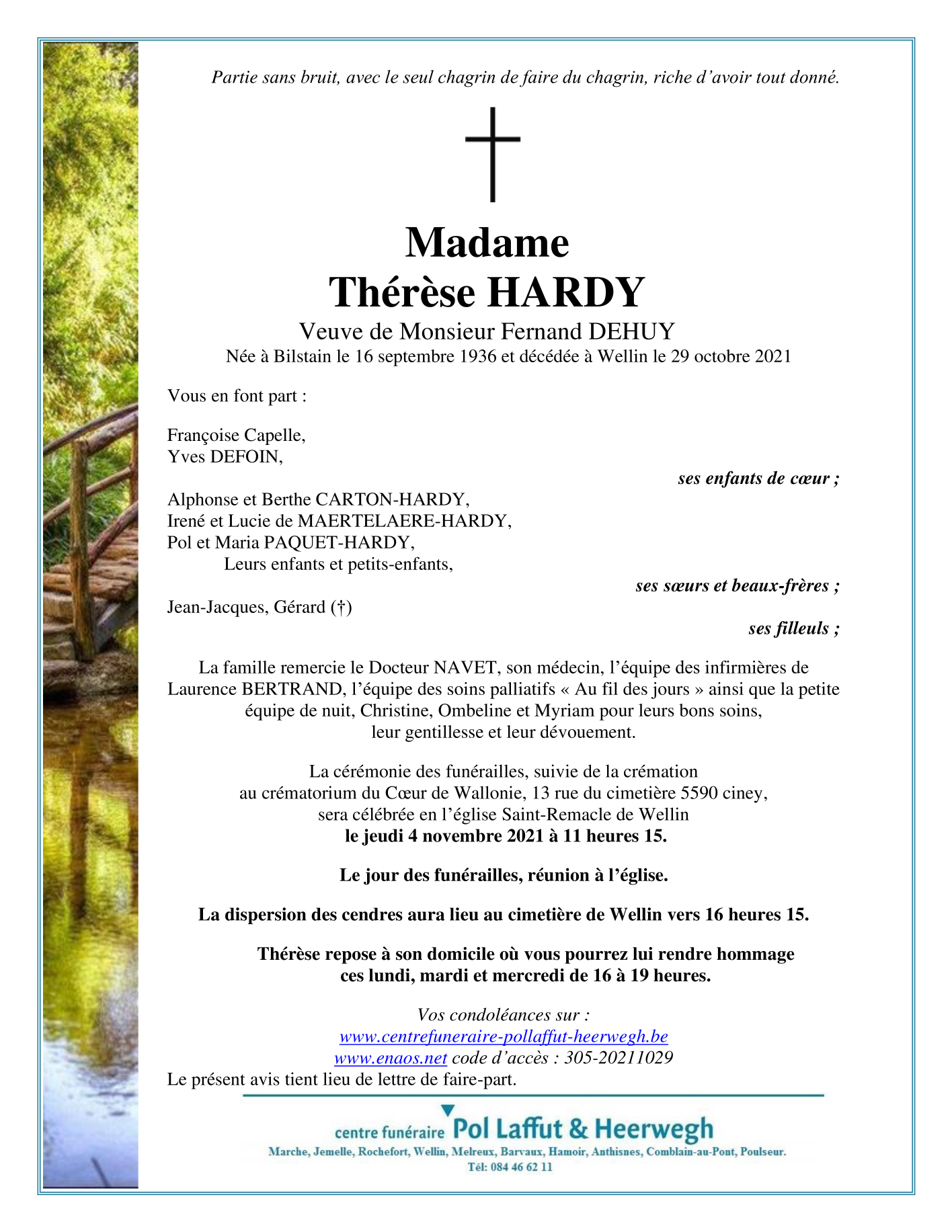 Décédée à Wellin (6920) le vendredi 29 octobre 2021 à l'âge de 85 ans