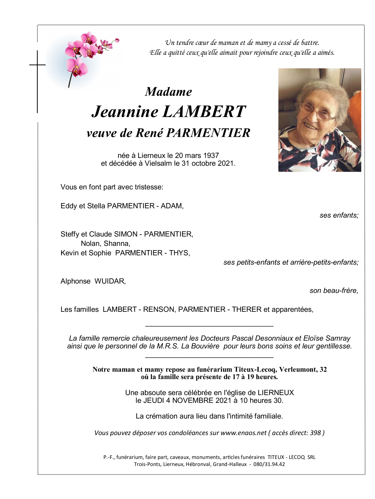 Fallecida en Vielsalm (6690) el domingo, 31 de octubre de 2021 a la edad de 84 años