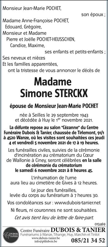 Décédée à Huy (4500) le lundi 1 novembre 2021 à l'âge de 78 ans