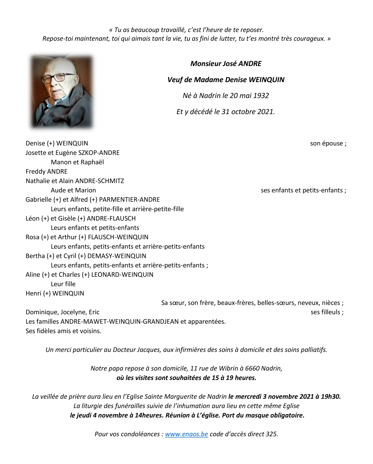 Overleden te Nadrin (6660) op zondag 31 oktober 2021 op 89-jarige leeftijd