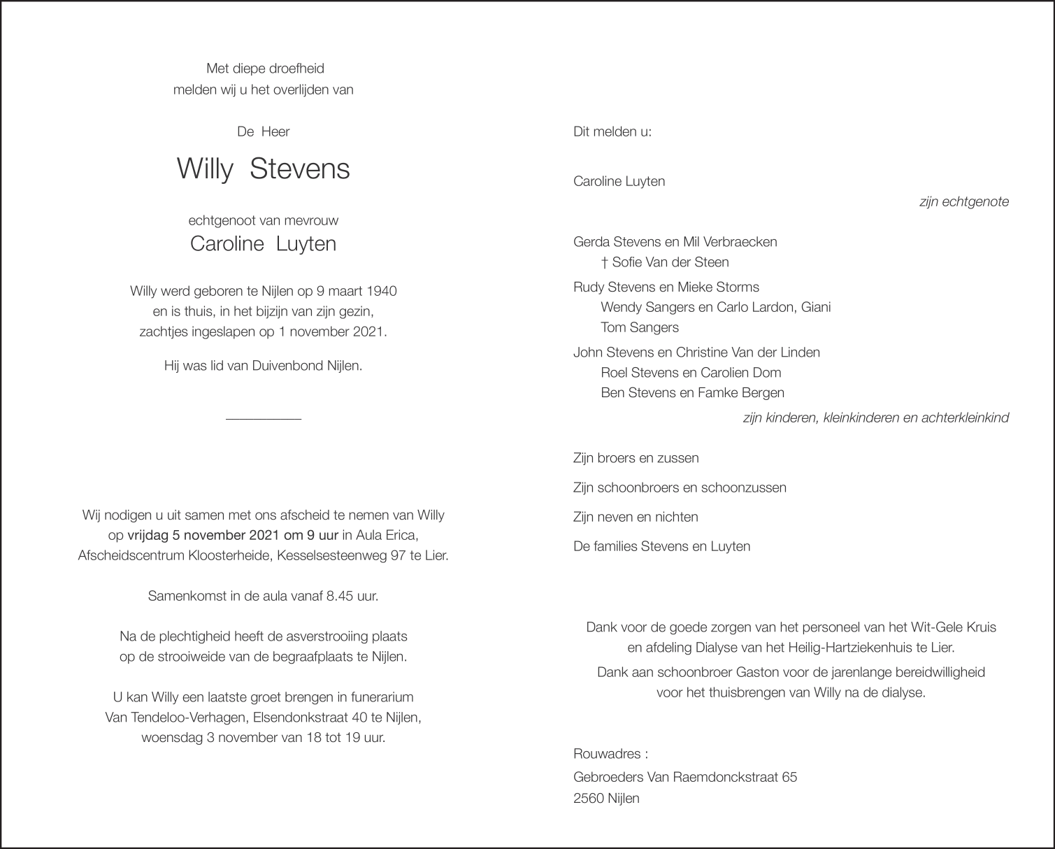 Décédé à Nijlen (2560) le lundi 1 novembre 2021 à l'âge de 81 ans